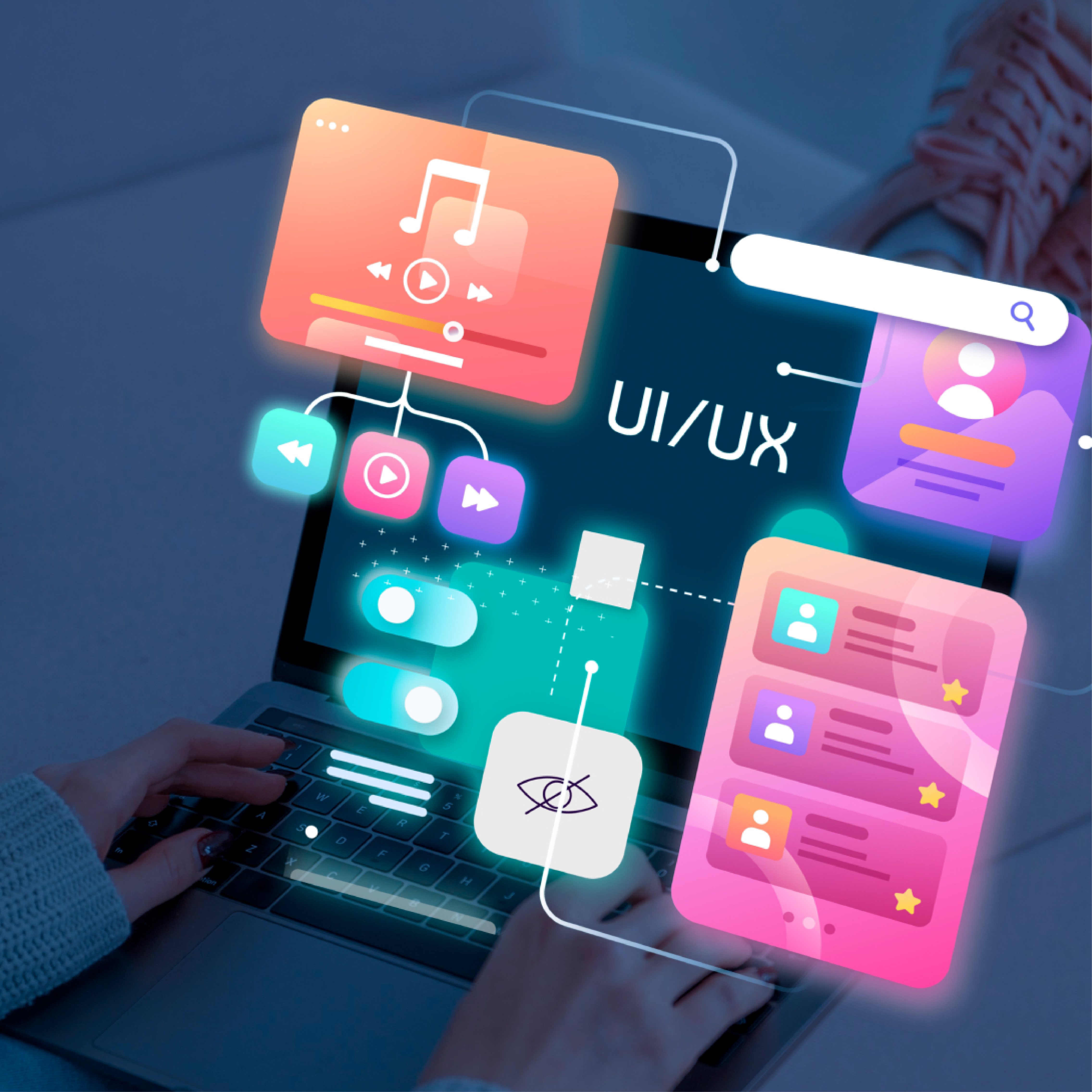 UI/UX designers work collaboratively with clients, developers, and stakeholders to understand user needs, product goals, and business requirements. They use tools like Figma, Adobe XD, Sketch, and InVision to create wireframes, prototypes, and design systems. Key services include user research, persona development, wireframing, prototyping, usability testing, and responsive design across devices.